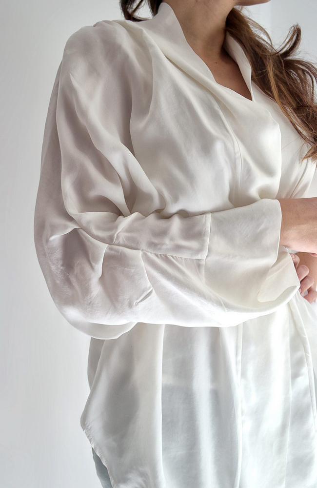 This is such a versatile blouson! It's so soft, you won't want to take it off. It has interesting details on iots sleeves. It's neutral and will go well with many different outfits and will work for a special occasion. You will be noticed!
